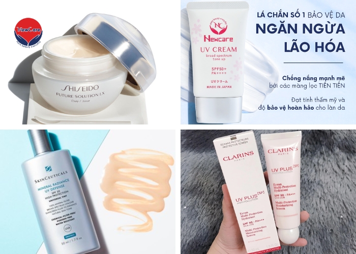 Kem chống nắng Newcare UV Cream SPF50+ PA++++ : Kem chống nắng cao cấp theo tiêu chuẩn Nhật Bản, chứa nhiều dưỡng chất cao cấp như Nhau thai ngựa, hoa anh đào Nhật, 10 loại thảo dược, giá khoảng 530.000 – 569.000 VNĐ