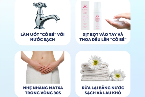 Bước 4: Rửa bằng nước ấm: Khi dùng dung dịch vệ sinh, hãy pha loãng sản phẩm với nước ấm và rửa nhẹ nhàng vùng kín. Sau đó, rửa lại bằng nước sạch và lau khô nhẹ nhàng bằng khăn mềm.