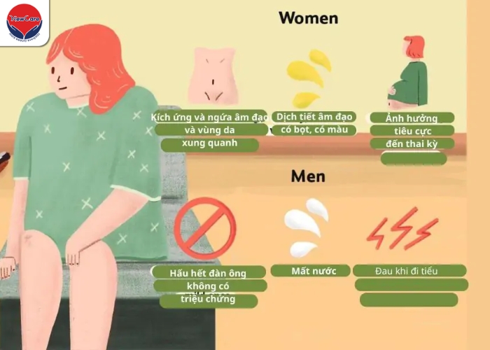 Ra nhiều khí hư bất thường (ở nữ): màu trắng đục, vón cục như bã đậu, không có mùi hoặc hơi tanh.